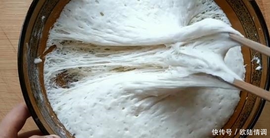 接下来需要把它盖起来,密封上,让它醒发一会,发到两倍大就可以了。发好了的面团可以看到它的里面是充满了气孔结构的状态的。