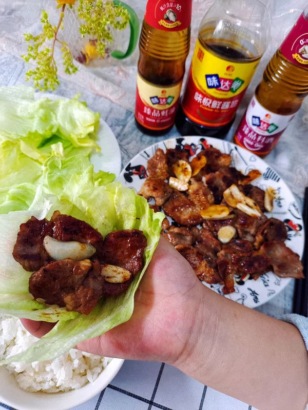 小贴士1这个蚝油和味极鲜酱油都有盐,不需要额外加盐了,如果大人喜欢辣味的可以加点辣椒粉。 2.也可以用大叶生菜包裹,颜色更好看,只是没有西生菜那么脆。