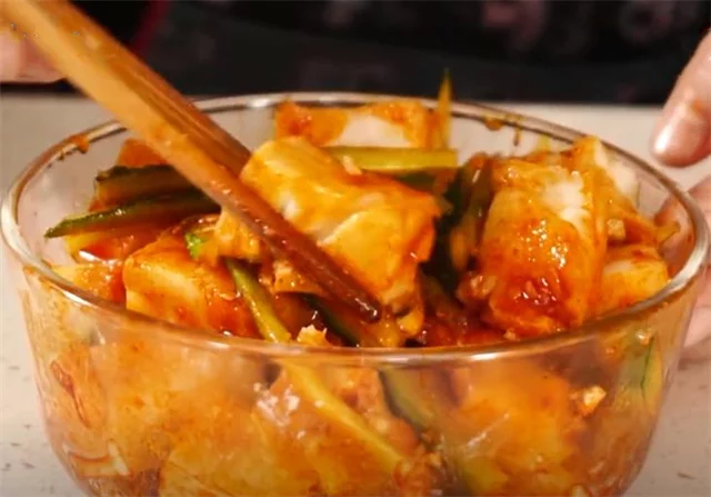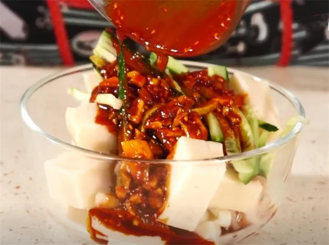 7.碗里加入黄瓜丝,再浇上刚才调好的料汁,拌匀即可开吃。