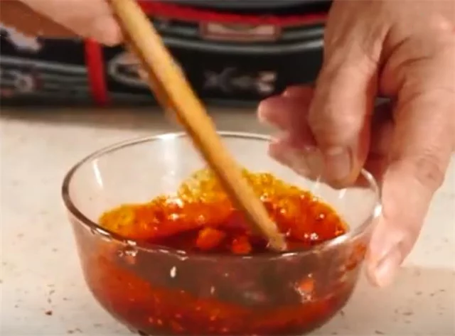 6.接下来调个料汁,碗里放点蒜末,加入一勺盐、香醋、生抽、再来一勺辣椒油搅拌均匀。
