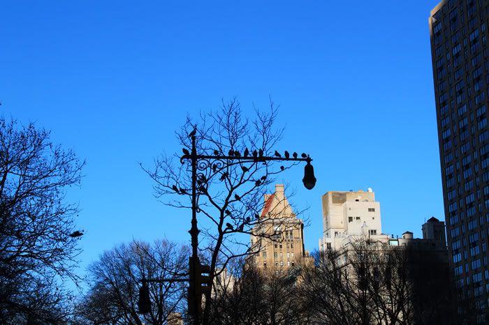 最后送上我最得意的片子一张,左边是中央公园的树影,右边是高楼大厦,中间是路灯上栖息的鸟儿们的剪影,桌面换起~~