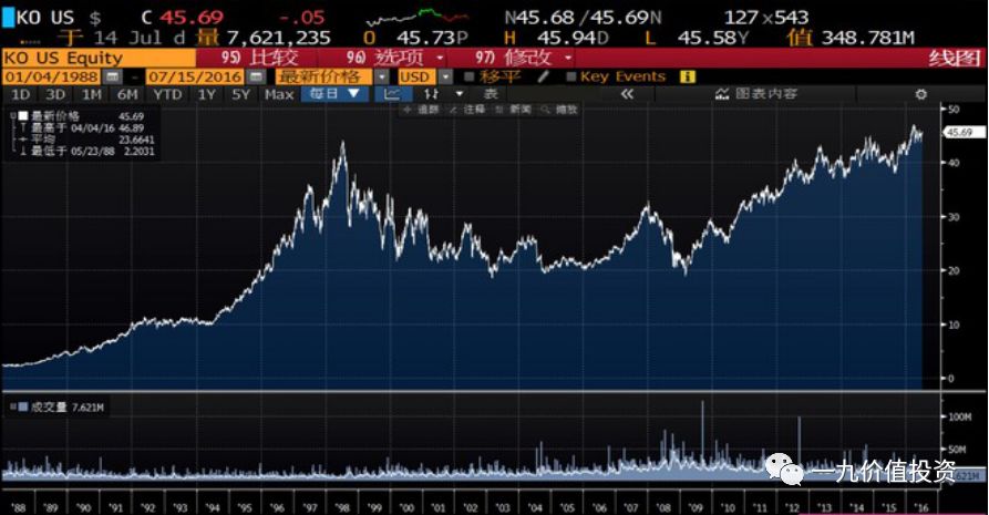 这一个故事可以分为三个来讲。第一段。1988年巴菲特开始买入可口可乐,共计投资约10亿美元。十年之后这笔投资升值到133亿美元,十年收益13倍,年化收益29%。而同时期可口可乐的利润增长率只有年均14.7%。老巴取得29%的年复利收益,另外一半的贡献来自于估值的提高。1988年老巴买入可口可乐的时候,正值股市熊市,可口可乐的PE只有15倍。而到了1998年7月中可口可乐股价曾高到70元/PE48倍。盈利的提升、加上估值的上升,标准的戴维斯双击。这是股价增长远超利润增长的原因。这是第一段故事。