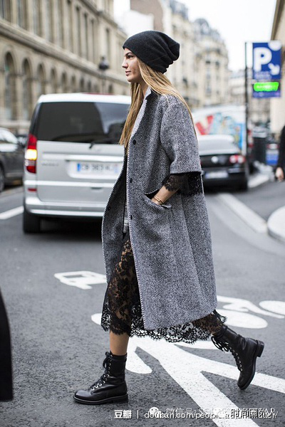 【灰色】搭配重点在于内搭的黑色蕾丝长裙,当然再冷些的话可以穿一条过膝长靴。