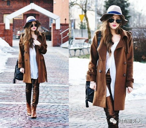 【棕色】依旧是色彩上的一致性。宽檐帽真的是人人必备搭配神器。