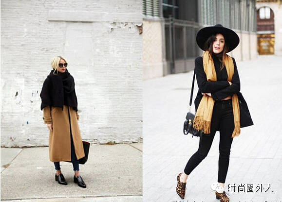 如果你一身都是深色系,那当然浅色或者花色,如果你已经有亮色,比如毛衣,或者裤子,鞋子颜色比较跳,那就可以用黑色来压阵