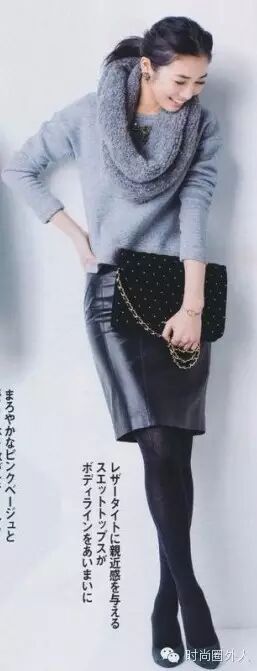 如果白色上衣和灰色半裙都是同一种材质就会显得风格很职业装。这里的上衣为毛线衫,打破了沉闷的同时又保持着端庄。