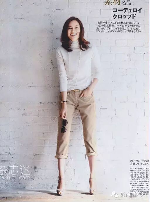 这张图里是稍浅一点的驼色,也就是卡其色,卷起裤脚至七分至九分的长度,露出脚踝,是日系穿衣里一个很重要的特点。
