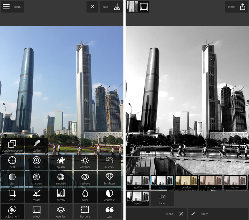 Snapseed 拥有“最直观操作方式”的修图界面,在手指的滑动中就能非常细微的调整照片的细节变化,这样独创的操作方式仍然是目前修图