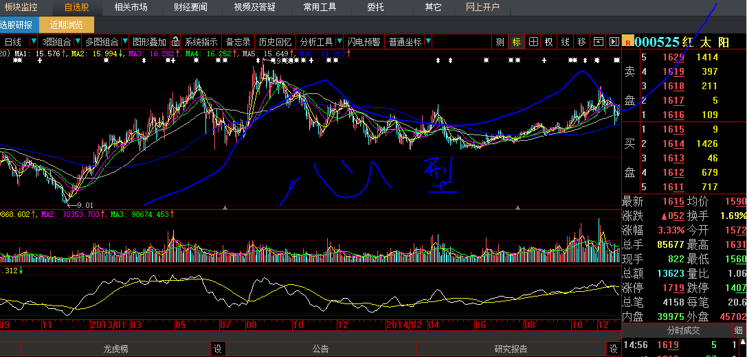 1、红太阳从2012年12月4日的8.93元—2013年8月22日的19.55元是大波浪的第1波,可以视为未来大图型的第1浪,1浪的高度决定未来3浪的高度(3浪最少也是1浪的1.38倍);19.55元——2014年3月11日13.03元是大2浪调整,时间与第1大浪运行的时间基本接近而匹配。你是在12月10日前后买入,已经比前期的买入者节约了16个月的时间,你知道16个月是多慢长吗?