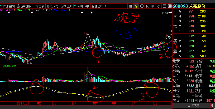 上图是600093禾嘉股份2014年8月26日图形,下面的技术指标中1、2、3我故意把它改造成反向的,当它死叉的时候,就是买入,反之卖出(是怕有人看我电脑偷取技术)。简单吧!你们去算算它最后的高度是不是与我教你们的高度算法很贴近?你们会发现,右脚越是下跌的少,涨幅就越高而不是反之。