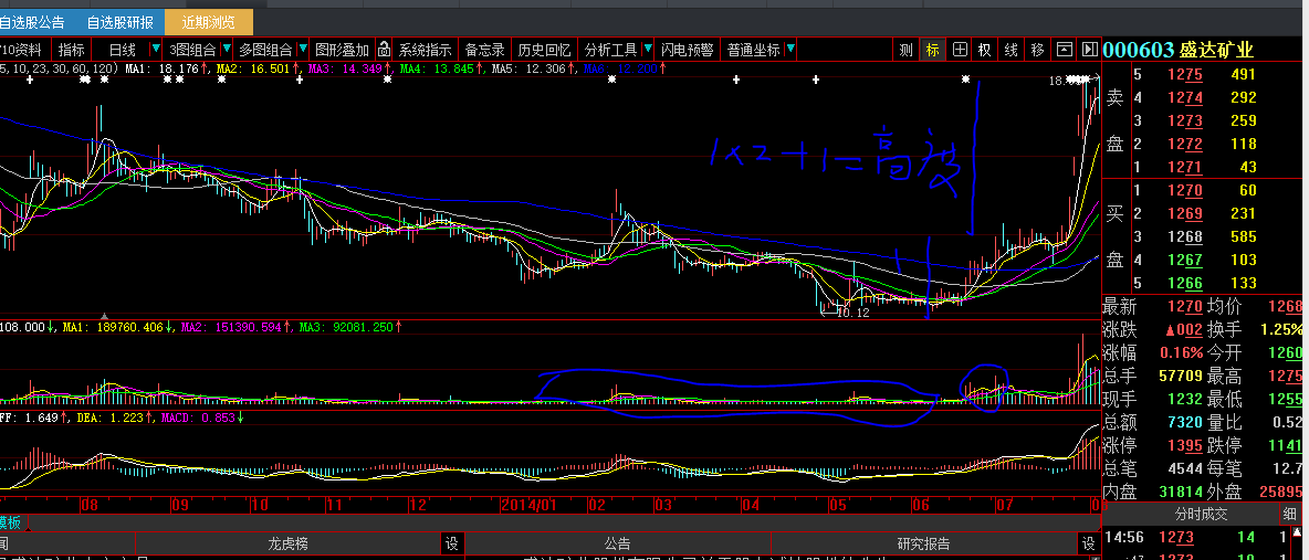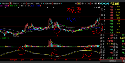 看看右边的均线内弓型的角度与力度、股价冲到最左边14.56元形成完美大双顶假象,为什么就没有人质疑左边最高价14.56,是从7.74开涨,本次是从9.56开涨,大心型长达数年的过程中已经有过2次大的波动完全消化了左边大顶的套牢筹码(这句话很重要,是看盘分析精髓,里面看其他图形相似股票,正因为没有这样的多次宽幅冲击,图形简单,就走不出波澜壮阔的大行情),本次上涨无论量度、角度、市场环境今非昔比,股价即使冲过左侧高顶14.56元2元钱,就会打开股价图形一片新天地,量度升幅不可限量。再看回落成交量的快速萎缩恰到好处,我就在那个时候写出《券商板块的行情其实才刚刚开始》散户不要被前期券商的涨幅所吓倒,它们的行情其实才刚刚开始(见我2014年11月写的专贴,帖子直白而坚定)!写贴的动机与勇气就是从这里来的。