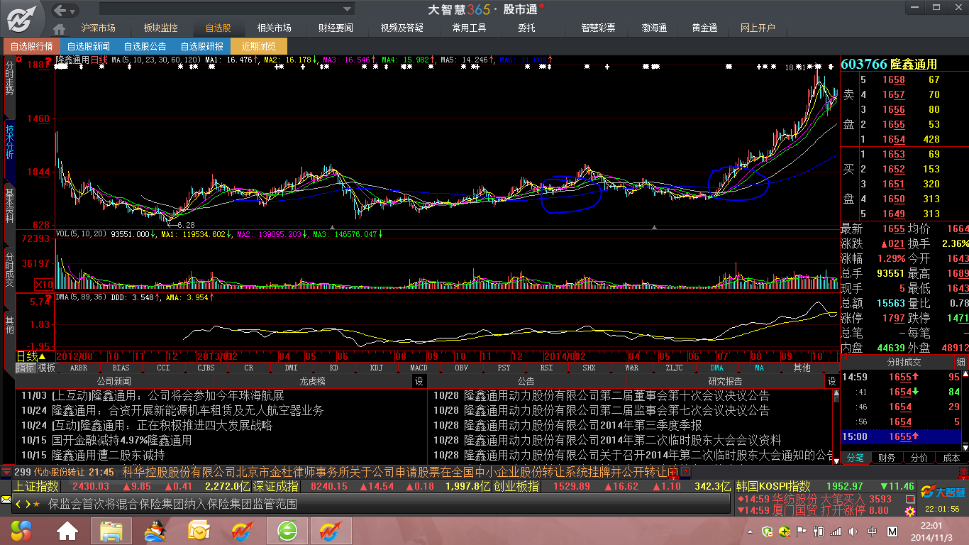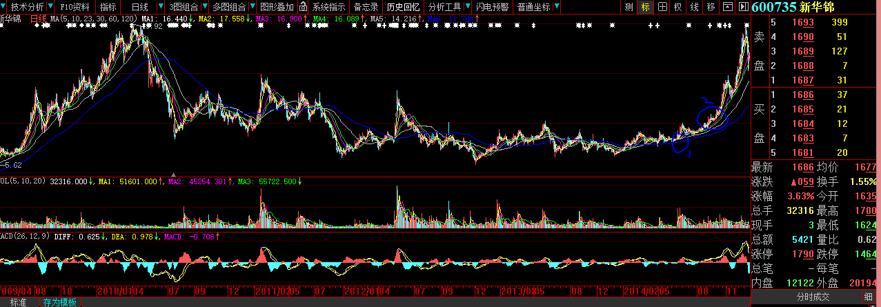 下图是新华锦,这个是我的实战股,当时买入90万股并且敢于在股吧里贴出来。看看现在正好半年不到涨了一倍有余。下图的第一个圈处是我的买入点,第二个圈处是到雪球后让粉丝跟进点。