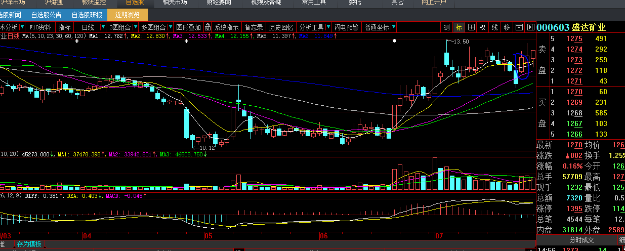 下图是000603盛达矿业2004年7月24日截图,你们看像不像上个帖子《如何狙击庄股》中的“丫”型?左面的成交K线方式与那个帖子里的贴图是不是几乎一模一样?其实,这就是“心形”的变形而已,就是“心形”穿了一个马甲,它还以为我认不出来。你们看图,5、10、30均线全部上穿60日和120日长期均线,下面的成交量与前期相比瞎子也看得清清楚楚,7月22日跳空高开甩掉上日长阴线,连续横盘2日消化左侧套牢盘让短线客走掉。我在2014年8月15日看到000715跳高开盘后,仅仅扫了一眼想也没想,就在开盘后3分钟打到涨停(卖单太少尽快建仓),第二天也是横盘了一天。就把在涨停板上2个小时都封不住的000050按照涨停价27.7元卖出翻身再全部进入000715,当天晚上就出公告停牌重组,预计2015年1月7日开盘,这个故事只能是明年再讲了。