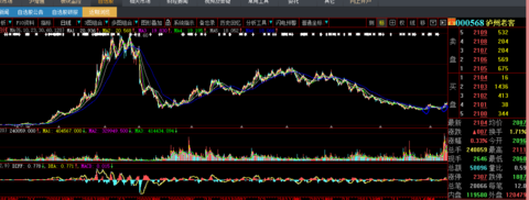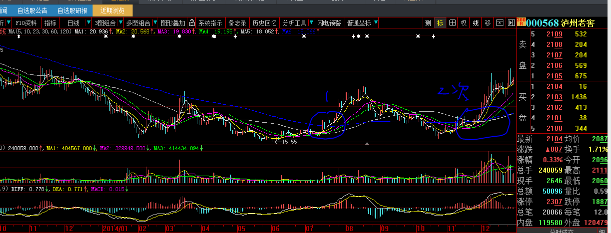 类似的例子举不胜举,为什么?这是股价上涨的必由之路,庄家没有任何办法可以回避股价上涨不穿越年线。例如今天我随手翻盘看到的000568泸州老窖下图。与上图股价连续2次上穿年线有什么区别呢?