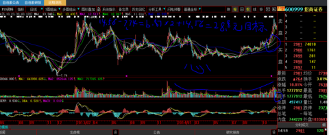 下图就是后来的结果,走到这一天,我就开始全面退出券商题材股(当时很多粉丝不理解),因为达到我的测算目标,股价理应进入宽幅震荡周期,并且对新来被套券商高位咨询菜鸟安心:你们很快会被解套并赢利不菲,请解套后不要再烦我(我恨那种底部不入高位抢筹的人,早干嘛去了?)。