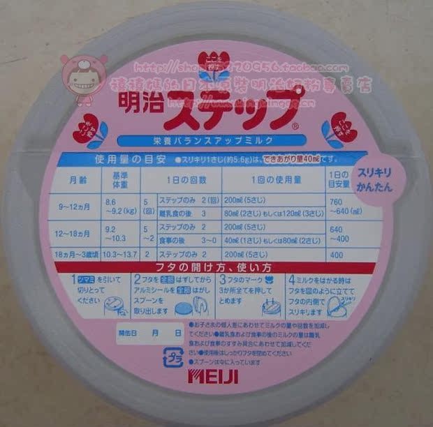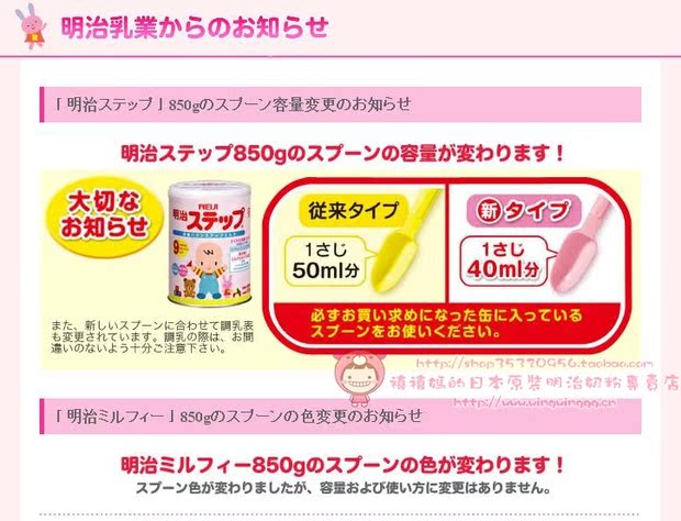 新版 明治2段罐顶上的使用说明(每勺40ml) http://img05.taobaocdn.com/imgextra/i5/46587578/T20pJdXenYXtP1upjX.jpg_620x10000.jpg 下图:左边为新版的盖顶,右边的是旧版的盖顶。区别在于每勺从奶量50ml变为40ml。 http://img02.taobaocdn.com/imgextra/i2/46587578/T20pJdXerYXtP1upjX.jpg_620x10000.jpg 下图为官方改版图示 http://img08.taobaocdn.com/imgextra/i8/46587578/T27VJdXnr7XtP1upjX.jpg_620x10000.jpg |