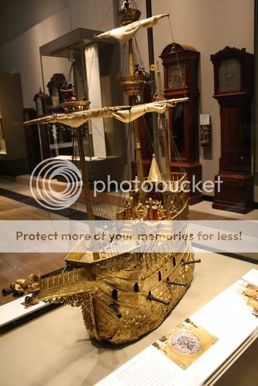 出来之后左转按回字型走到42展厅看萨腾胡船的遗物。这艘满载着武器、盔甲、钱币、器皿和珠宝的长舟很可能是7世纪初期东安格利亚国王雷德沃尔德[Raedwald]的船葬墓室。
