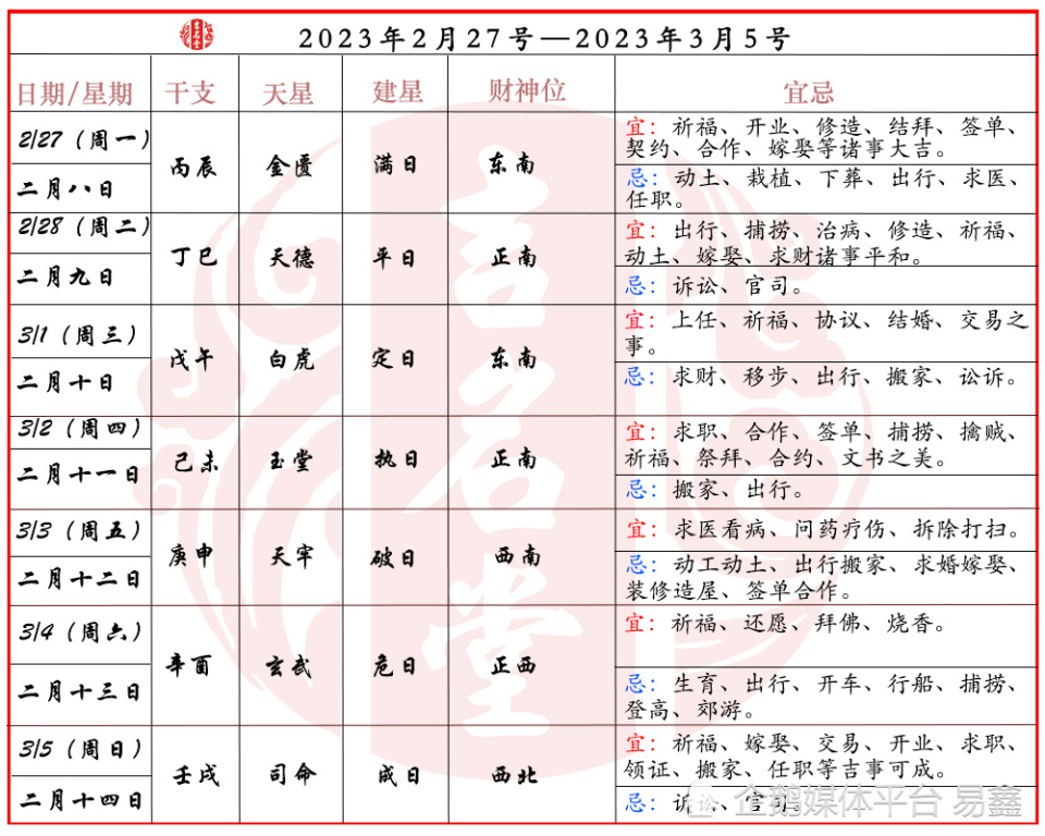 一周黄道吉凶日:2023年2月27日—3月5日(收藏)