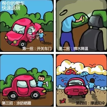 车主在停车时不仅要考虑交通方便等问题,还要考虑到尽量防止车辆在烈日里暴晒的问题,尽量把车停放在阴凉通风处。同时,在夏天洗车时,可以常常清洗一下水箱,可去除附着在上面的杂物,这样发动机更容易散热。专家建议,给爱车准备一把防护伞遮阳板,是一种不错的选择。