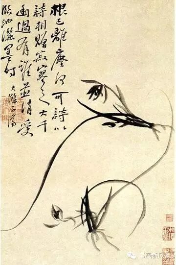 石涛《兰花图》中兰叶瘦劲,浓墨托出,交迭穿插,兰花散发出幽香。粗细长短的笔踪、枯湿浓淡的墨形,经过疏密聚散的组合,使整幅画显得轻松明快,充满了生意。