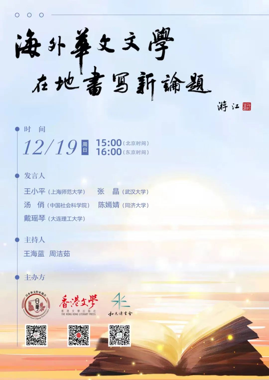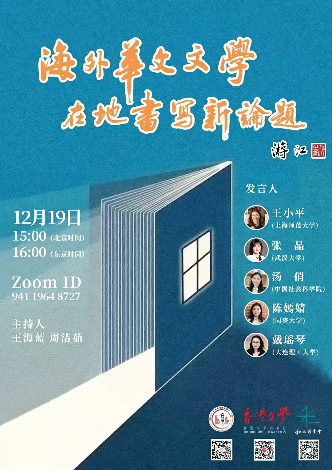 共同举办这场别开生面的研讨会的三方,是日本华文作家协会、《香港文学》杂志以及和光读书会。日本华文作家协会,旧称日本华文文学笔会,今年正好成立10周年,年末即将迎来他们本年度最具份量的《日本华侨报》杯日本华文文学奖颁奖盛典。而《香港文学》杂志,创刊36年来已成为香港文学和海外华文文学研究者必不可少的文学杂志之一。《香港文学》杂志游江社长还特意为本次研讨会的海报题了字以作支持。而和光读书会,启动于2018年6月,创始人是戴瑶琴博士,其成员是大连理工大学中国语言文学学科点的师生。“和光” 读书会的定位是本硕贯通、90后及00后、文理交叉,以主题沙龙和作家课堂的形式,把读书与创作同时推进,他们已在中国作家网、收获公众号、香港文学杂志等多家媒体刊物上发表过书评专辑。三方在顺利完成这场“海外华文文学在地写作新论题”研讨会之后,还相约明年在适当的时机再联手筹备和举办新的文学活动,期待海外华文文学事业越来越强大。