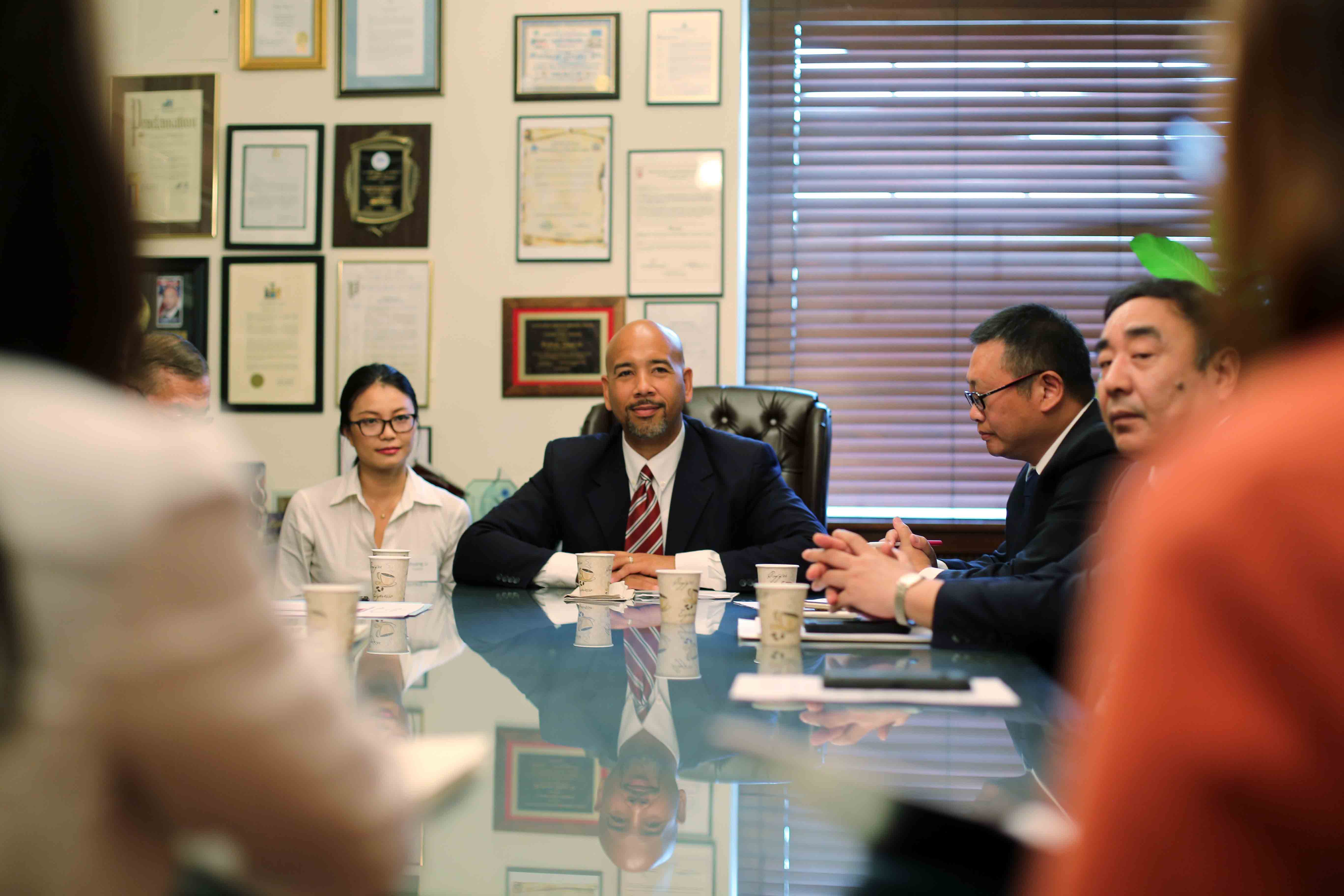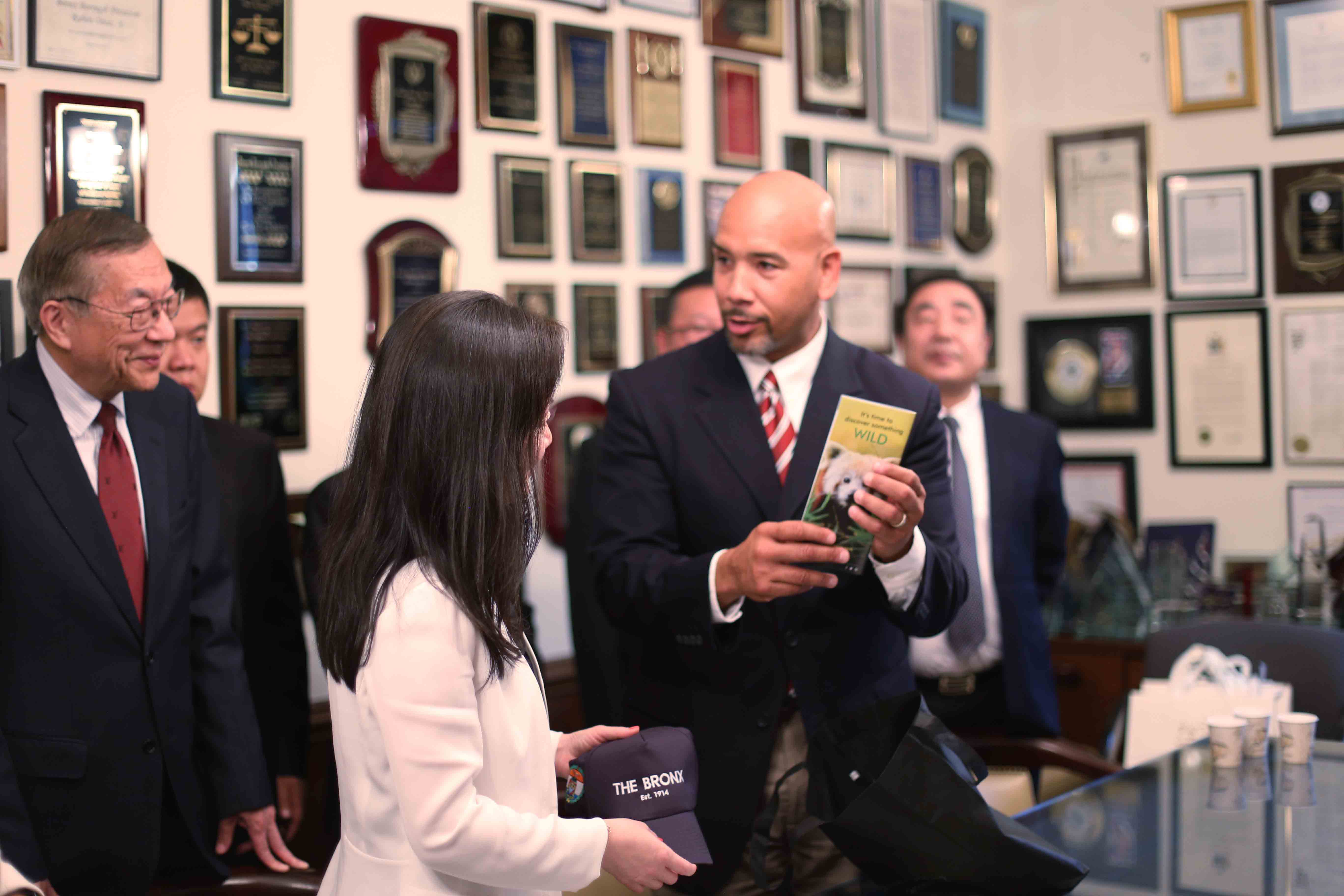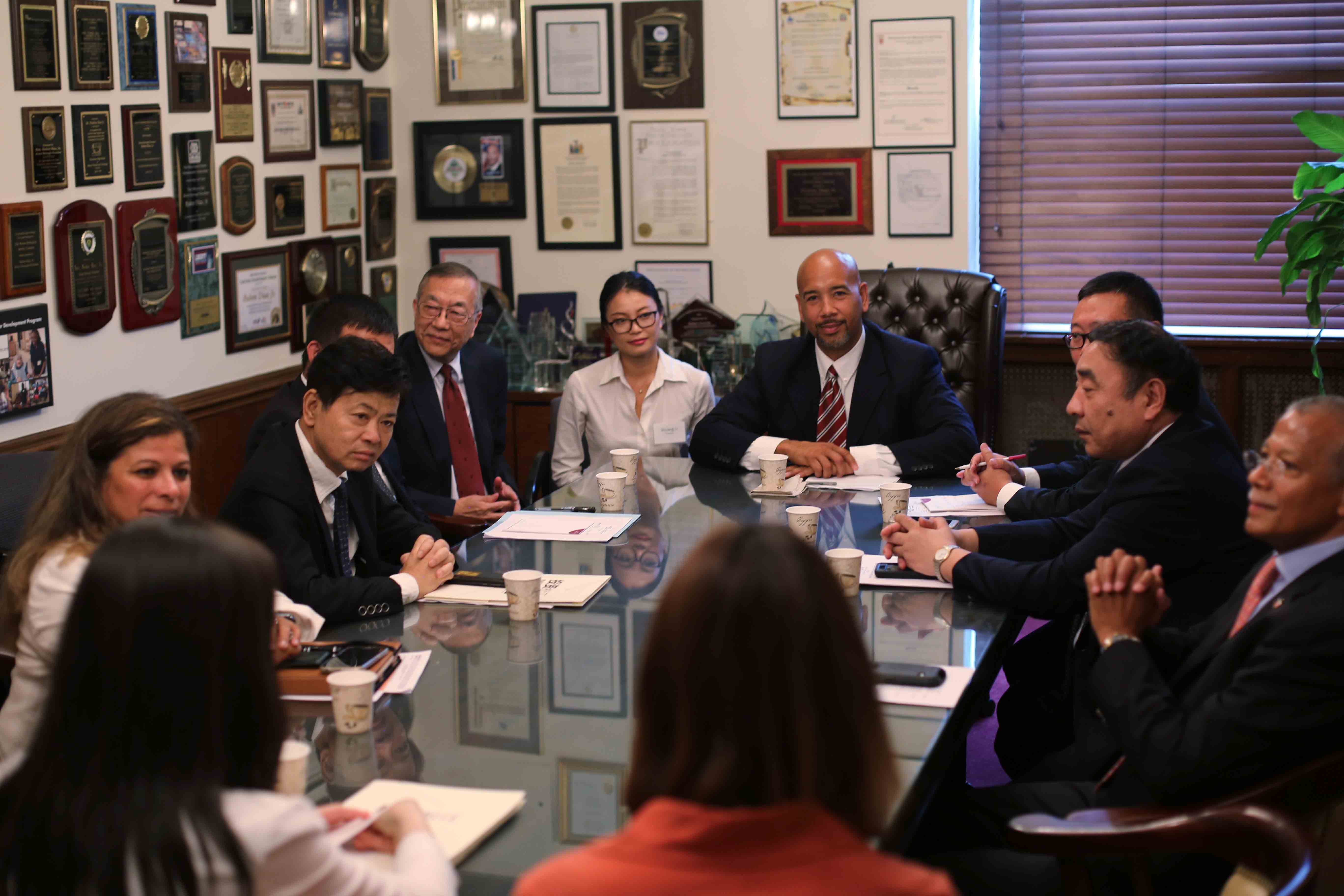 上午11时左右,龙副区长一行人及翻译到达迪亚兹区长所在的布朗克斯区政务大楼,在一间挂满各类奖章的会议室与迪亚兹会面。会谈进行得热烈轻松,迪亚兹的幽默带来了不少欢笑。