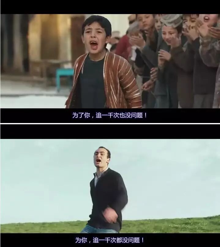 直到又一次“风筝大赛”后,这次争当“追风筝的人”的阿米尔笑着对索拉布喊出那句话,那句二十六年前,索拉布的父亲哈桑,笑着对阿米尔喊出的话。