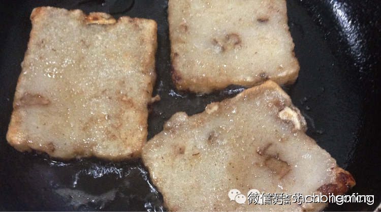 将切好的崇明糕以三块为一组(若您家平底锅够大可以放置更多),入平底锅两面各煎炸1分半钟为宜。