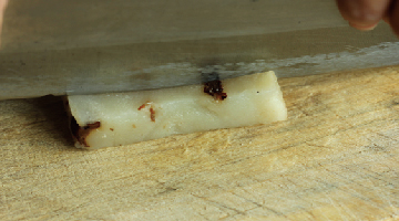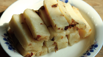 首先请大家取出冰箱中已切成条状“坚硬如铁”的崇明糕若干。