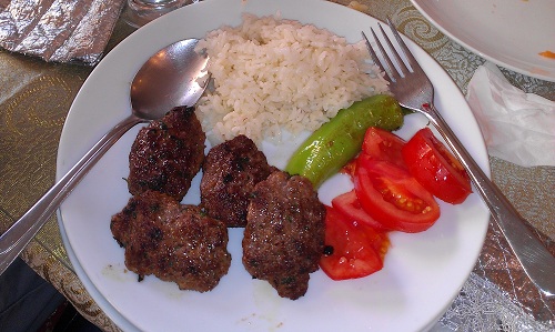 这道土耳其烤肉丸饭,比较诱人的是四个烤肉丸,米饭是用黄油蒸过的。