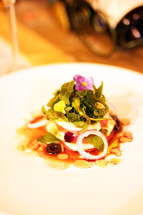 一份意大利蔬菜汤之后,前菜出场——番茄水牛芝士坚果蔬菜沙拉。番茄片和水牛芝士交叠,覆盖着新鲜的芝麻菜、生菜、洋葱圈、黑橄榄和各种坚果,油醋汁调味,点缀三色堇,清爽好吃。