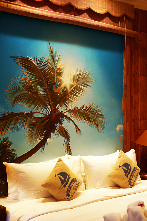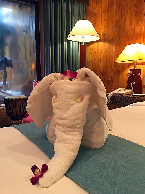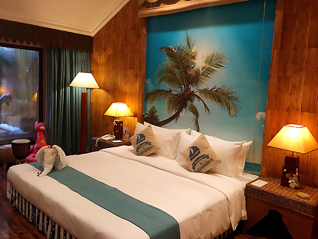 吃完晚餐返回房间,房间里别致有趣,满满的度假风。床上用毛巾折叠成有趣的动物造型吸引了小朋友的注意。床边一脚摆放着羊驼造型的沙发椅,让人忍俊不禁。