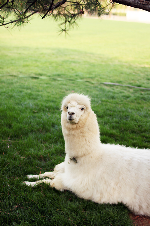 温和又萌态常现的羊驼,这里常年溜达着一棕两白,白天在草坪吃草,太阳落下时,夜宿西山。