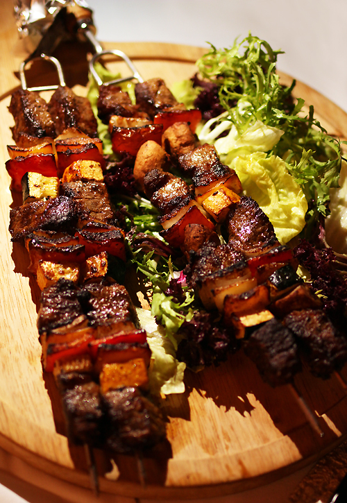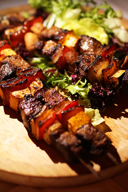杂菜串烧黑椒牛仔肉,迎面而来的夏日气息。黑椒牛肉、口蘑和双色彩椒,一支两串,吃起来超过瘾!