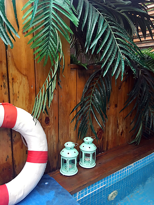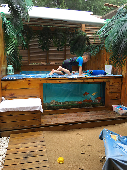 主题房内独立汤池,绿树掩映,入住前早已消毒放水等待着客人的到来,小朋友还可以玩沙子垒城堡,自在玩耍。