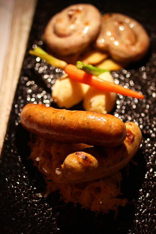 德式串烧香肠,意大利肠、慕尼黑肠、图林根肠,三种风味香肠拼盘,佐以酸菜、土豆泥、迷你胡萝卜和芦笋,各有各的风味。