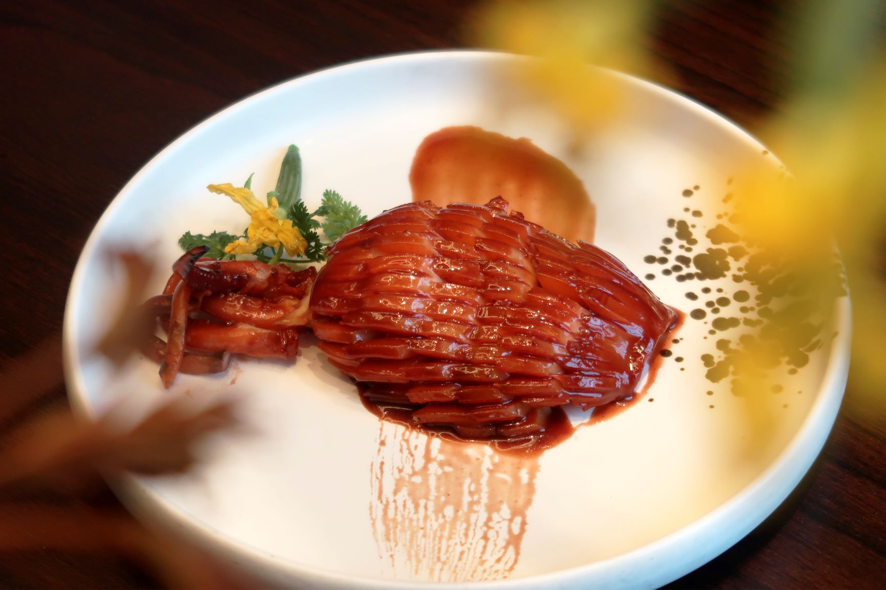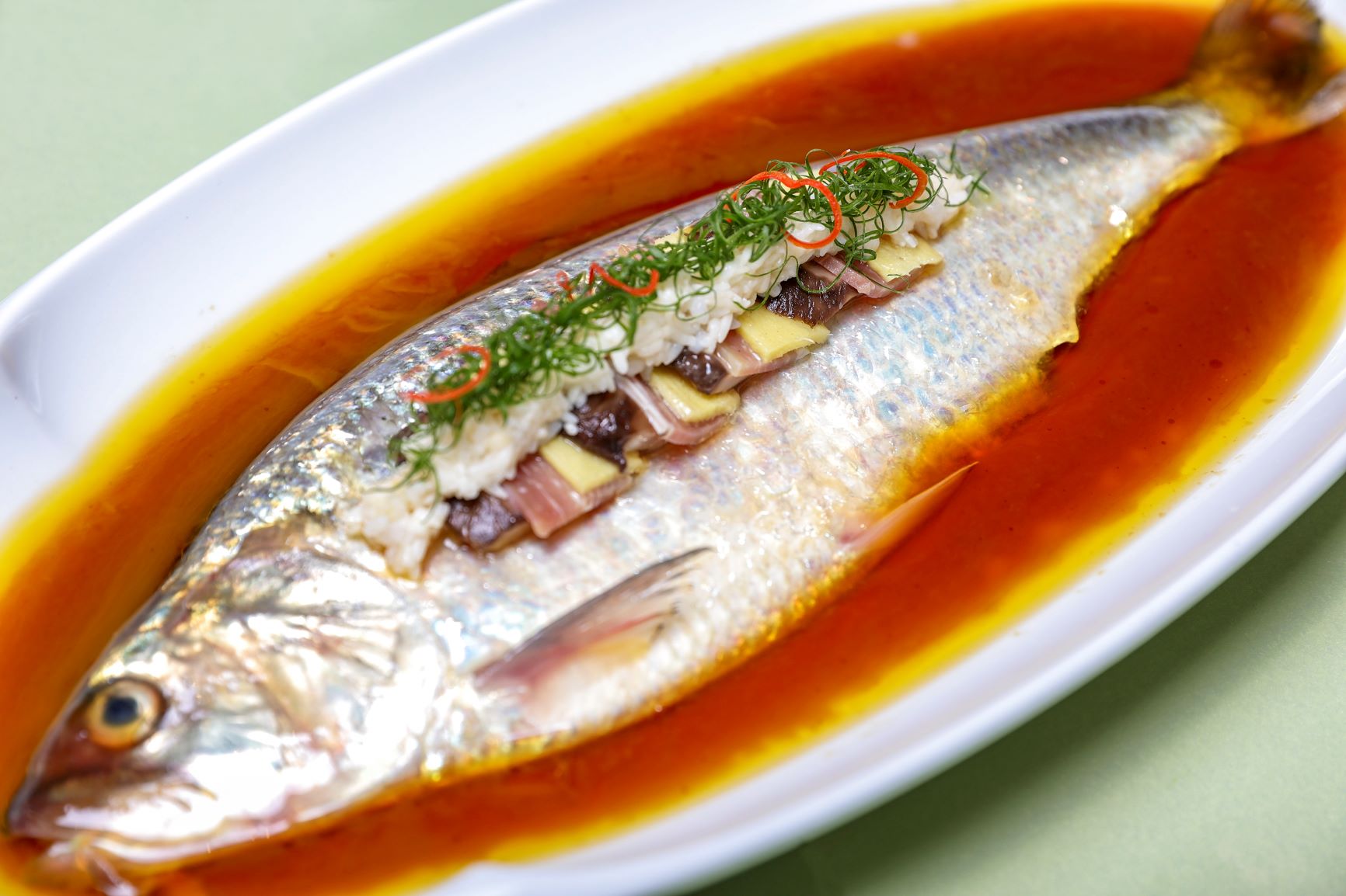 有“鱼中之王”美称的鲥鱼,体宽似椭圆白玉盘,鳞片银光闪闪,最让人念念不忘的,便是一片片鳞片下,那油脂丰腴的口感。用筷子轻戳,先吃一口泛着淡淡酒香的鱼肉,再吃一口被蒸汽宠幸过的火腿,余味缭绕,回味无穷。