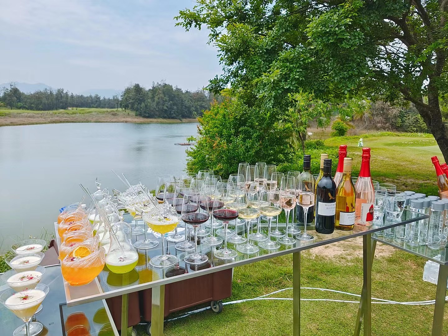 上午11:00起,参赛嘉宾陆续抵达球场签到。为打造有仪式感的高球赛事,福州东湖万豪酒店不仅为参赛球员订制了高球服装及万豪旅享家球帽,同时为了让参赛球员有良好的击球状态,储备体能且保持精神充沛,酒店还为参赛球员专属打造了一场高端且有创意的“湖边草坪午餐简餐会 。