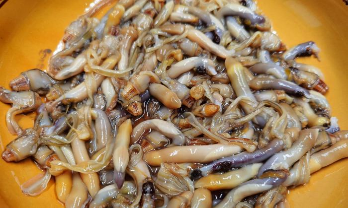 今天给大家介绍的这种海鲜,它的名字叫蛏子,是生活在海滩流沙中的一种海鲜。每到退大潮的时候,很多人都会拿着工具,带着盐去海边挖,挖到蛏子洞以后,在洞口撒点盐,受到盐的刺激后,它能够在洞穴中迅速上下移动。受惊时,很快缩入洞内,看到蛏子出来以后,要迅速地把它抓住。我们几个挖了两个小时,就一大盆。