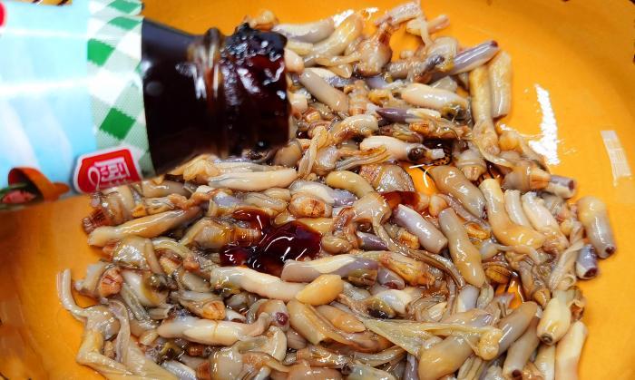 第一步:蛏子挖回家以后不能直接吃,要用海水浸泡一天,让蛏子把肚子里的沙都吐出来,然后再将蛏子清洗干净,将蛏子的外壳剥开,将肉取出,清洗两遍,用刀切成小段,装入盆中,加入适量的生抽,加入适量的葱姜水,加入适量的蚝油,加入适量的盐,搅拌均匀,腌制20分钟。