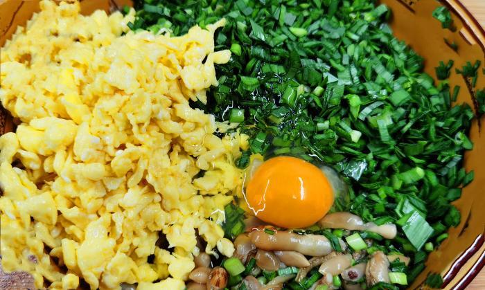 第二步:热锅加油,油热后倒入蛋液,调为小火,用筷子将蛋液搅碎,炒熟放凉备用。韭菜清洗干净,控干水分后,切成小段,将韭菜和鸡蛋都装入盆中,打入一个生鸡蛋,这是素馅饺子好吃的秘诀。