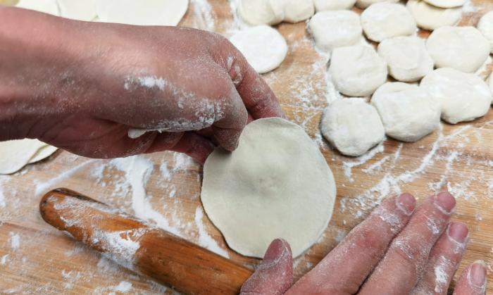 第四步:盆内加入适量的食用油,滴两滴香油,加入适量的盐调味,搅拌均匀。取一个饺子皮,托在手中,放入适量的菜馅,将菜馅包起来,两边虎口收口,捏一下,一个饺子就包好了!