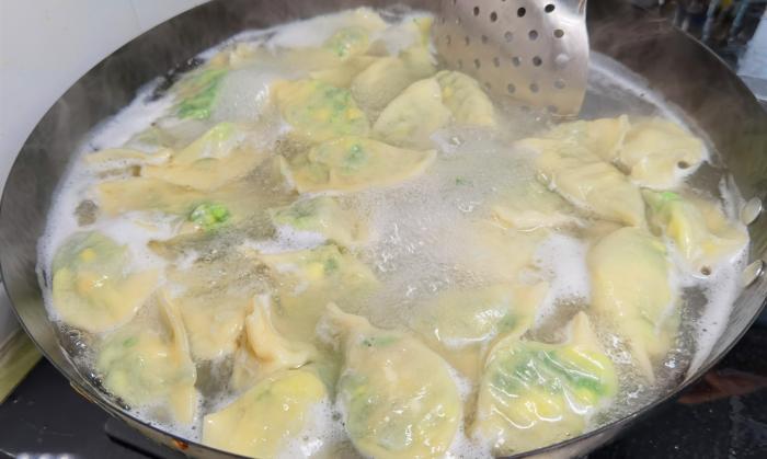 第五步:锅内加水烧开,下入饺子,用漏勺推动一下,防止饺子粘锅底,煮两个开,饺子皮都鼓起后,饺子就可以出锅啦。鲜香美味的三鲜水饺就做好了,吃着特别的香。