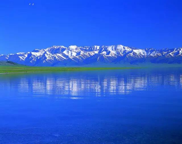 自驾在赛里木湖,往远处眺望,朵朵漂浮的白云下是一座座还未完全融化的雪山。青墨色的雪山又倒映在在一汪蓝得灼伤人眼睛的湖水中,那是一种说不出比划不了的颜色。