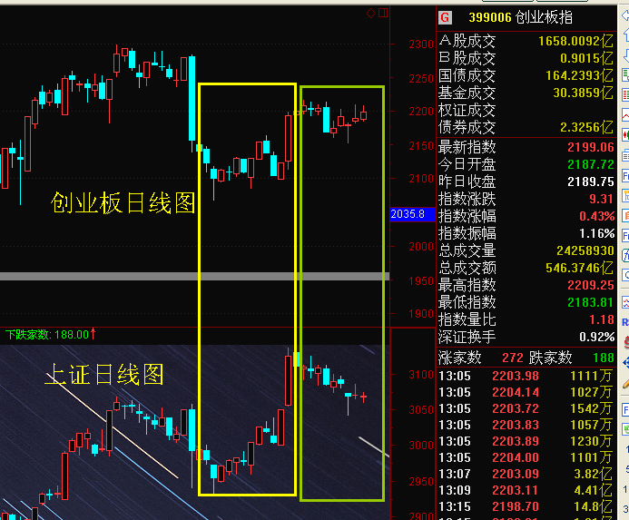 13:23 我们再来看下创业板日线和上证日线的对比图,第一个框,上证指数明显强于创业板指数,不过上证摸了年线后震荡回落,而这时候创业板日线开始强于上证,因为创业板短期还没碰到年线,涨幅明显落后于上证,加上最近创业板日线运行在均线密集区上方,理应会有补涨。