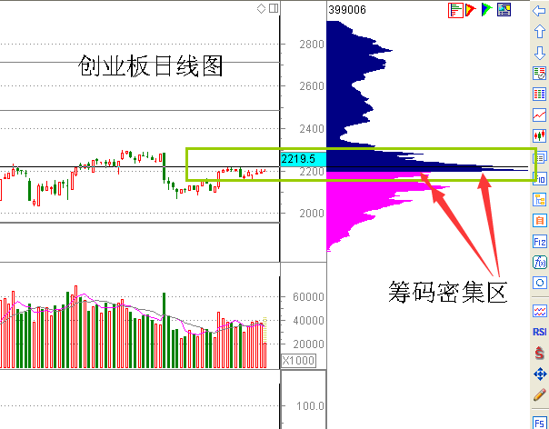 指数上,昨天收评分析短期创业板日线图稍微强于上证日线图,那么中午午盘继续围绕这个话题展开。如果今天创业板指数继续收阳的话已经6连阳,不过6连阳都没走出有效走势出来,而且都是反复拉上下影。那么,创业板指数到底为何会反复拉上下影?我们来先看下创业板指数的筹码分布图,笔者在前面一段有分析过,创业板在2220一区域有比较密集的筹码成交区,这个区域会有点压力,所以个人觉得最近创业板在这个点位附近反复拉上下影有点震仓的味道。再且,短期指数每次下跌也没啥量,如果下跌没啥量的话说明杀跌动能有限,这样的话对多方就有利,后面很容易走出多方的走势。现在我们根据盘面走一步看一步,短期不要盲目的看空也不要盲目的看多。