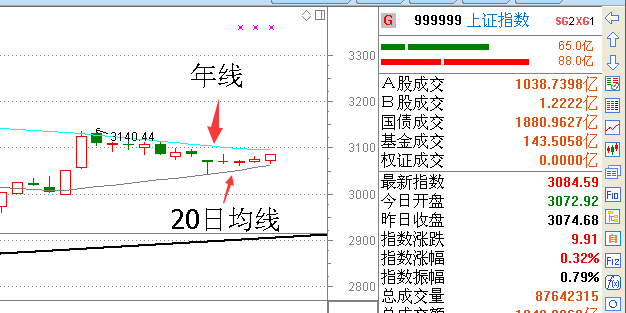 13:14:34 指数从均线上看,现在年线和20日均线已经慢慢收敛了,短期我们盯着20日均线就行