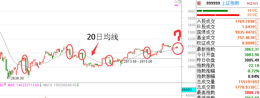 首先,从均线上看,笔者在前几天一直反复提醒,指数不管怎么震荡我们短期盯着20日均线就行,历史走势上看今年好几次跌破20日均线都是以灌肠阴的方式跌破(如图)。那么这次是不是也会来个灌肠阴?笔者认为这个没什么可比性,因为历史不会简单重复的。当然,短期我们继续参考20日均线的支撑力度,如果支撑不住的话短期还是要往下探的走势。
