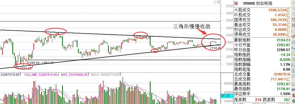 所以,通过今天的盘面特征显示下周指数估计还是继续走震荡的走势,而且指数都七连阳,再出连续阳线的概率会越来越低,所以后面的日k肯定会有阴线。当然,如果指数要打破震荡格局还是需要蓝筹们的合力,否则每天只动用一两个蓝筹其他蓝筹又不买账这样的拉法没卵用。不过,还是老话,目前指数大周期来看处于震荡蓄势的走势,这几天指数一回震荡那种每次以为要涨却不涨、每次以为要跌却补跌的感觉又回来,好比如今天的指数早盘看着感觉很危险要跌的样子,结果午后又偷偷的小拉了回来。最后,再稍微说下创业板指数,创业板指数目前在三角形的末端(如图),近期估计要酝酿一个比较大的变盘点,因为这个三角形的周期不小。总之,现在指数大周期走势没有改变,我们心态上不能操之过急。
