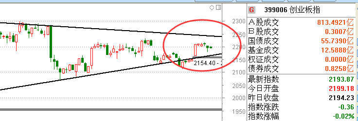 10:19:23 创业板指数三角形越来越收敛,后面应该会走出一个比较大的变盘方向出来,目前在三角形末端,估计还得磨一小段时间。